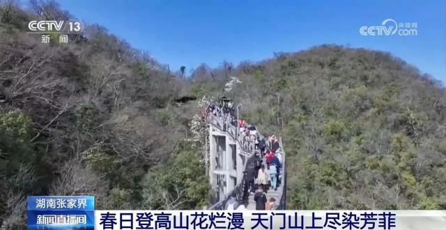 在湖南张家界,天门山国家森林公园假期首日就接待游客超2万人。山间野樱花、杜鹃、玉兰点缀,游客登高望远,俯瞰春色满山。