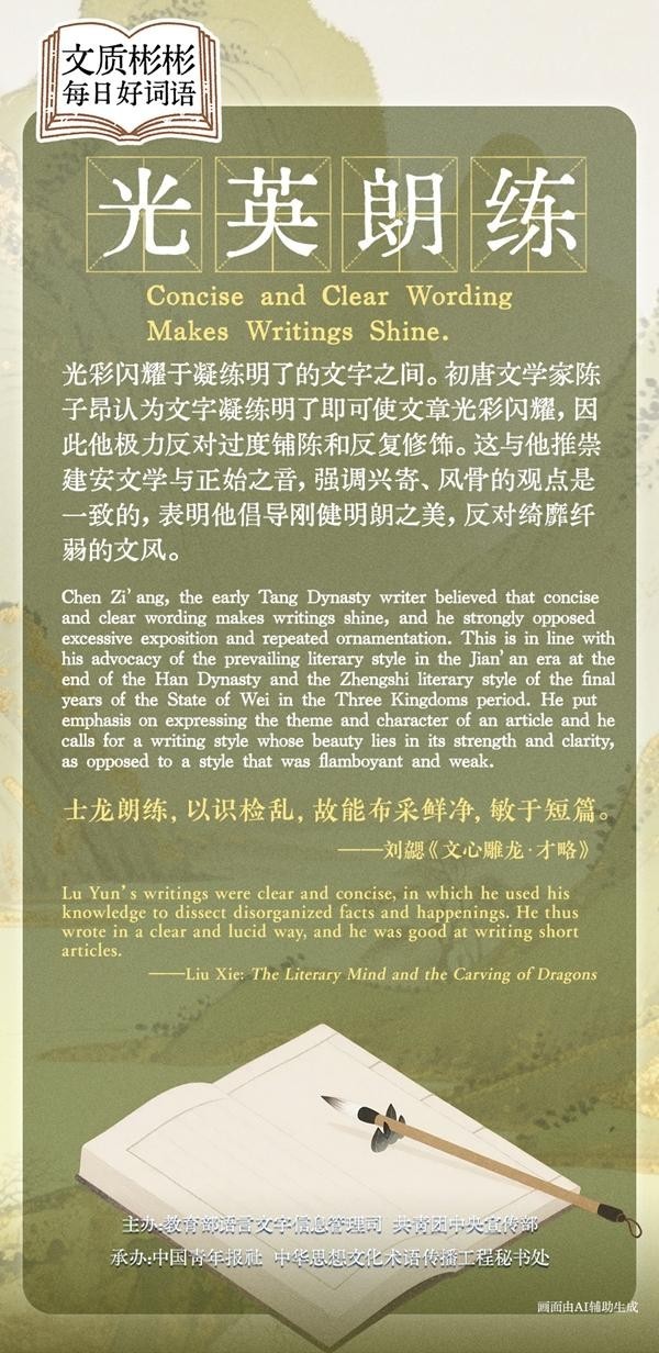 光彩闪耀于凝练明了的文字之间。初唐文学家陈子昂认为文字凝练明了即可使文章光彩闪耀,因此他极力反对过度铺陈和反复修饰。这与他推崇建安文学与正始之音,强调兴寄、风骨的观点是一致的,表明他倡导刚健明朗之美,反对绮靡纤弱的文风。