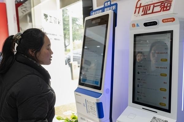 3月25日,上海,闵行区零工市场浦江站,一名求职者在查看电子信息屏上的招聘信息。赖鑫琳/摄