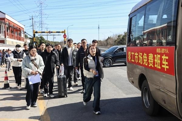 3月10日,上海,浦东新区零工市场上川路服务中心,劳务派遣招聘经理王巧巧(前)带求职者乘坐免费班车,准备前往企业面试。在这里,一上午便汇集了来自全国各地的400多位求职者。 李茂君/摄