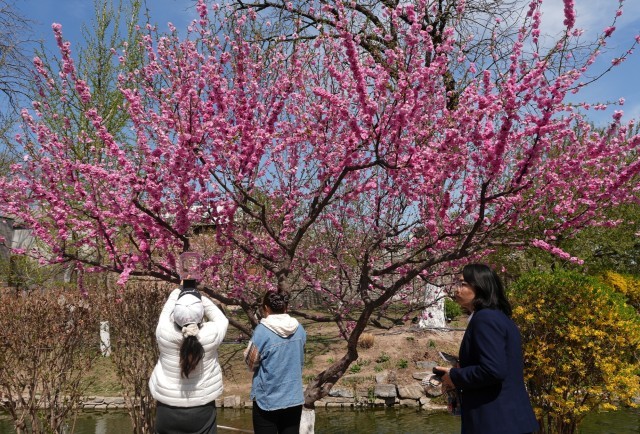 春日的北京也吸引了不少外地游客专程打卡。在北京北海公园,两位来自山西的大学生穿着汉服,在花间拍照留念。“春天出来走走,风景美,花也开得艳,心情都变好了。”一位大学生说。