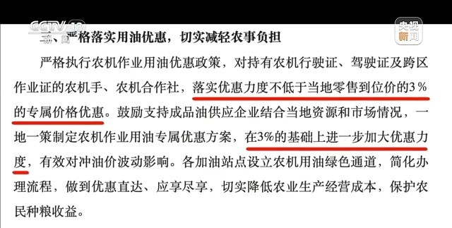 事实上,在2022年,农业农村部曾与中石化、中石油签署了合作框架协议,强调要优先优惠保障农机作业用油。今年2月,山东省也发布类似优惠3%的方案。此外,山西和山东两省还都强调,要加大“送油下乡”“送油到田”服务力度。而在上海,中石化联合上海市相关部门,专门发行“石化助农卡”,优惠直接到账,符合条件的农机户,持卡加油每升直接便宜3毛钱。眼下,正值农耕关键期,农机手们也期待这样的优惠措施能覆盖到更多地区。
