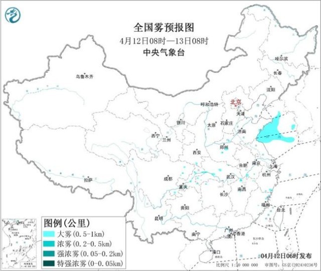 中央气象台4月12日06时继续发布大雾黄色预警: