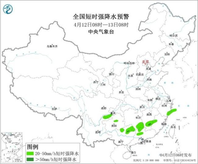 预计4月12日08时至13日08时,江南东部和南部、华南北部、西南地区东部等地的部分地区将有8级以上雷暴大风或冰雹天气,其中,广西北部、广东北部、江西南部等地局地将有10级以上雷暴大风,最大风力可达11级以上;江南东部和南部、华南北部等地的部分地区将有小时雨量大于20毫米的短时强降水天气,其中,江西南部、广西北部等地局地小时雨量大于50毫米。