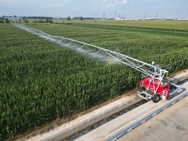 在河北省衡水市安平县的麦田里,移动式智能喷灌设备正在作业。新华社记者郭雅茹 摄