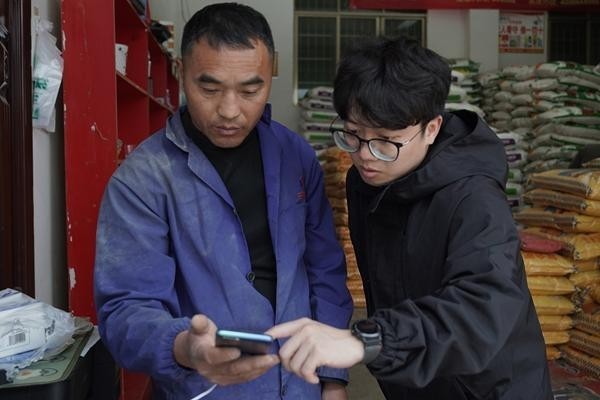 曾梓杰向乡村“拼多多驿站”负责人讲解如何用手机处理快递包裹业务。受访者供图