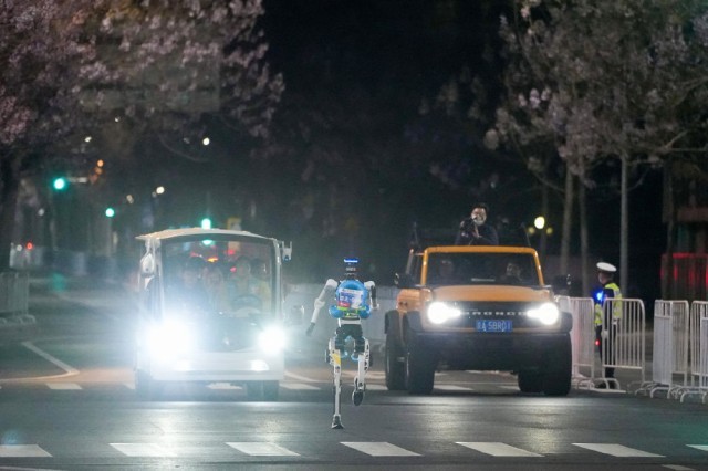 2026年4月11日晚,一台机器人在测试活动中奔跑。4月11日晚至4月12日凌晨,2026北京亦庄人形机器人半程马拉松全流程全要素测试活动在北京经开区举行。