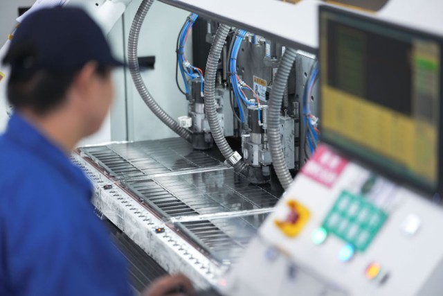 工作人员在吉林化纤集团国兴复材有限公司车间操控雕刻机加工碳纤维复材制件(2025年9月17日摄)。