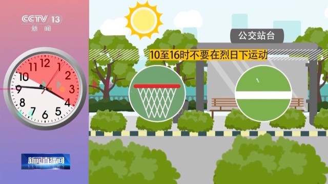 出行方面,尽量避免或减少户外活动,尤其是10—16时;不要在烈日下运动;若外出应采取必要防护措施,如打遮阳伞,穿浅色衣,并带上充足的水和防暑药品。