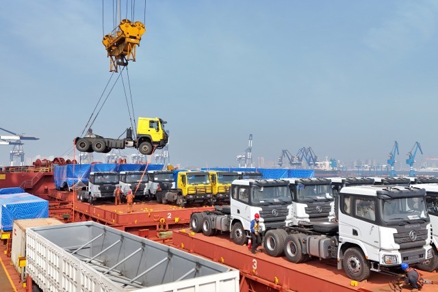 4月14日,出口几内亚的卡车在山东港口烟台港装入中非班轮(无人机照片)。新华社图