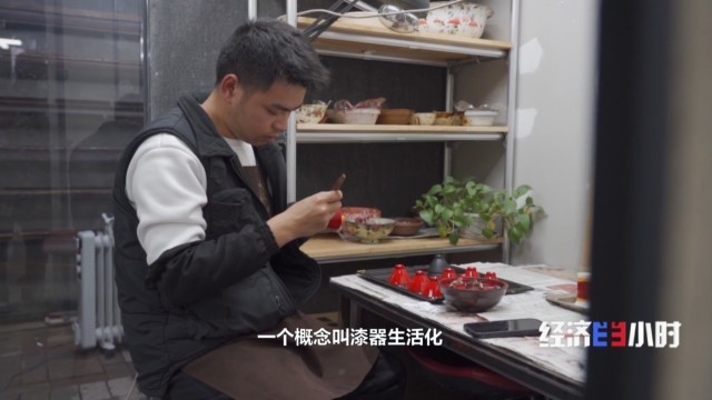 这个开设在茶馆里的漆器文创店,独特之处在于采购体验于一体。漆器不再被锁进玻璃柜,而是被放置在茶桌旁、展示架上。消费者可以上手体验简单的打磨工序。