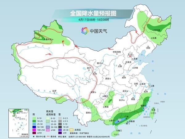 明天,新疆西部和北部、内蒙古东北部、黑龙江北部等地部分地区有小到中雨(雪),其中,新疆北部局地有大到暴雪。黑龙江大部、吉林北部、西藏东南部、四川南部、云南东部、重庆东部、贵州北部、江南南部、华南大部、海南岛、台湾岛等地部分地区有小到中雨,其中,广西东部、广东西部、福建东部等地部分地区有大雨。