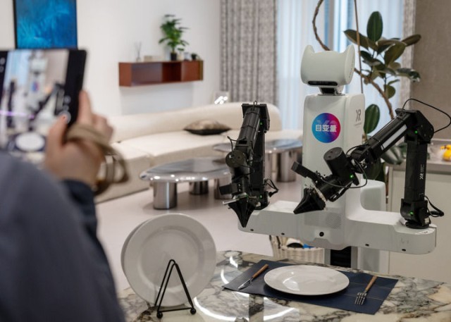 2026年3月27日,在广东省深圳市南山区,自变量机器人科技(深圳)有限公司开发的具身机器人在执行摆盘任务。新华社记者 刘梦琪 摄