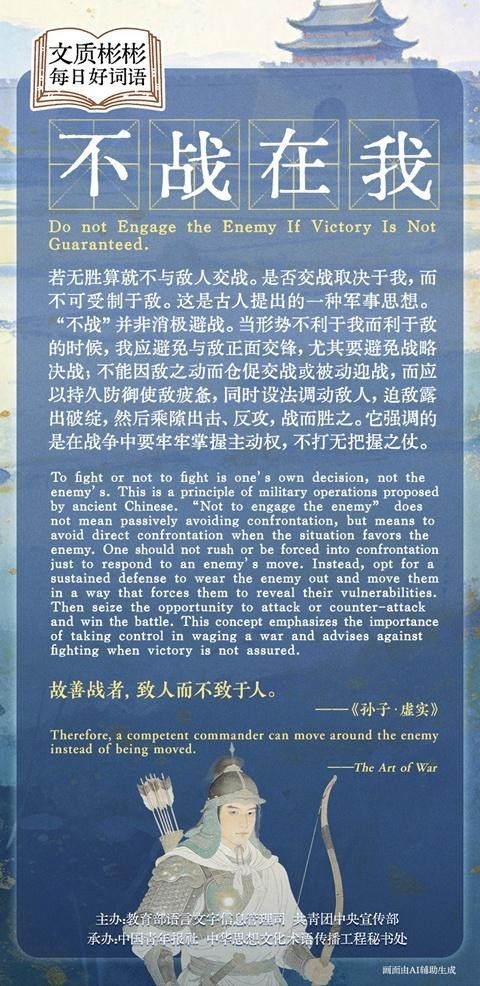 To fight or not to fight is one's own decision, not the enemy's. This is a principle of military operations proposed by ancient Chinese. "Not to engage the enemy" does not mean passively avoiding confrontation, but means to avoid direct confrontation when the situation favors the enemy. One should not rush or be forced into confrontation just to respond to an enemy's move. Instead, opt for a sustained defense to wear the enemy out and move them in a way that forces them to reveal their vulnerabilities. Then seize the opportunity to attack or counter-attack and win the battle. This concept emphasizes the importance of taking control in waging a war and advises against fighting when victory is not assured.