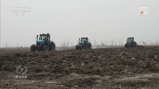在塔克拉玛干沙漠西南边缘的新疆喀什麦盖提县五征农场,记者看到大规模机械化春耕作业已经开始,多台大马力拖拉机列成雁阵,正在棉田里进行春耕的第一道工序——犁地。