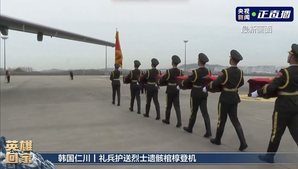 中韩双方代表现场签署交接书,中国人民解放军仪仗司礼大队礼兵持国旗护送烈士棺椁登上解放军空军“运-20B”运输机,烈士英灵将回到祖国和人民怀抱。