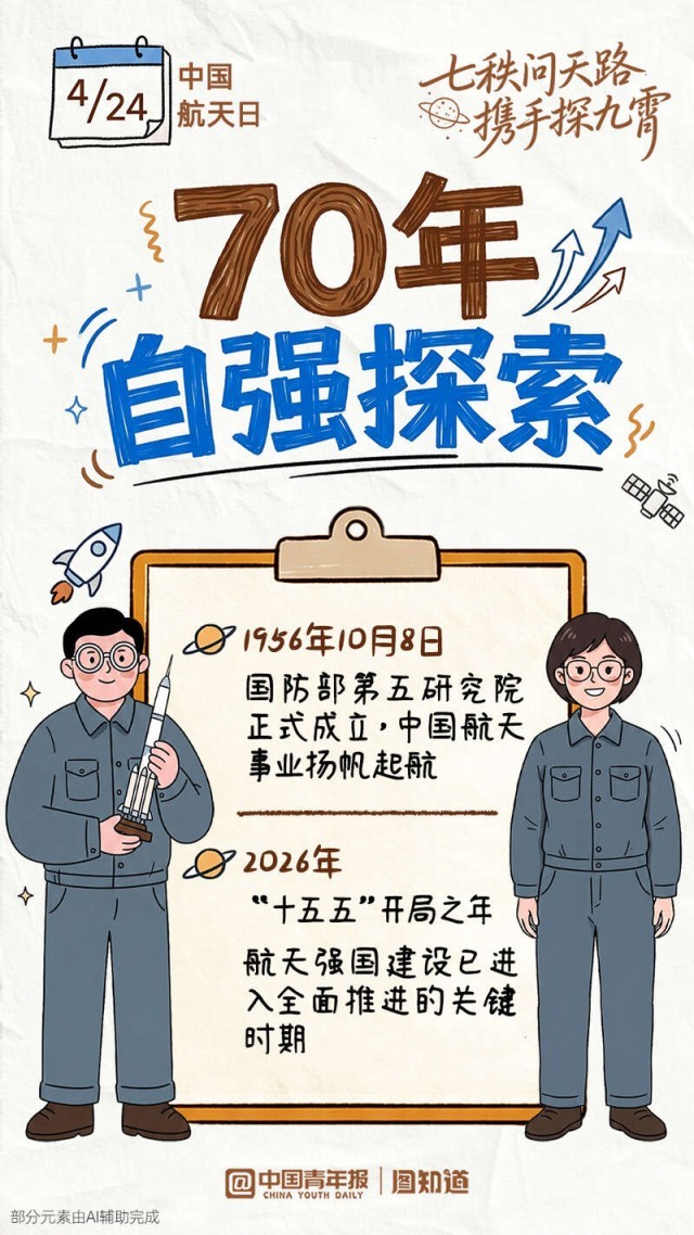 今年是中国航天事业创建70周年。从第一颗人造地球卫星“东方红一号”成功发射,到载人航天、月球探测、火星探测等重大工程捷报频传,几代航天人用一个个坚实的脚印,在浩瀚宇宙中书写着属于中国的壮丽篇章。4月24日是中国航天日,共赴星辰之约,续写问天新篇。
