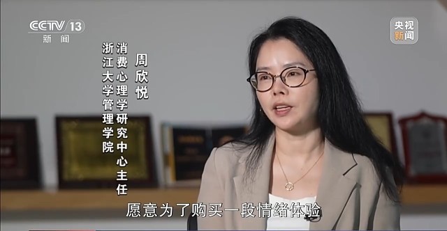 浙江大学管理学院消费心理学研究中心主任 周欣悦:情绪消费其实是消费者愿意为了购买一段情绪体验,而进行的消费行为,而且愿意去支付溢价,也就是愿意额外再多花钱。我们消费者的关注点,从外部物质世界转换到内心精神世界的这样一个过程。