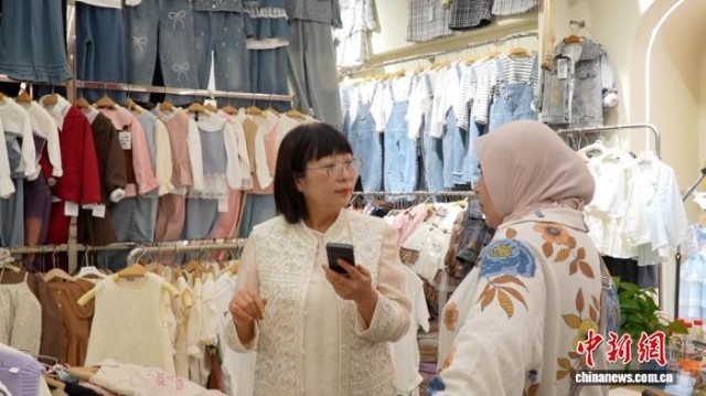 一大早,在织里镇沿街的一家童装店内,负责人文晓莉正忙着接待两位来自乌兹别克斯坦的客商。双方围绕童装款式、价格、订单细节展开细致洽谈。
