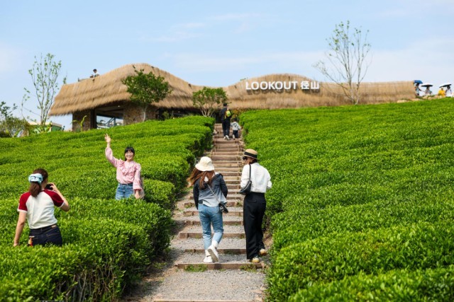 4月26日,游客在杭州市余杭区径山镇小古城村的茶山上游玩。新华社记者 江汉 摄