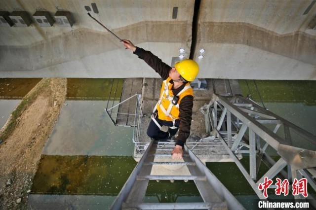 图为铁路职工攀爬在桥梁上进行检测维护作业。张中海 摄