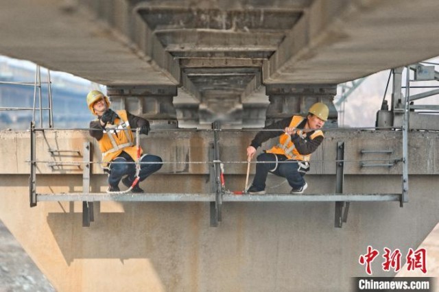 图为铁路职工攀爬在铁路桥梁上进行检测维护作业。 张中海 摄