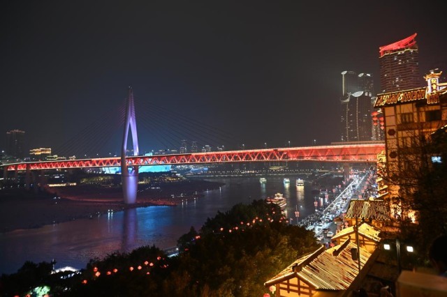 夜幕低垂,长江与嘉陵江交汇而成的渝中半岛灯火璀璨,游人如织。两岸高楼和大桥上的灯光洒向江面,倒映出极具立体感的城市景观,随着一艘艘两江游轮驶过,粼粼波光变幻出万千色彩。
