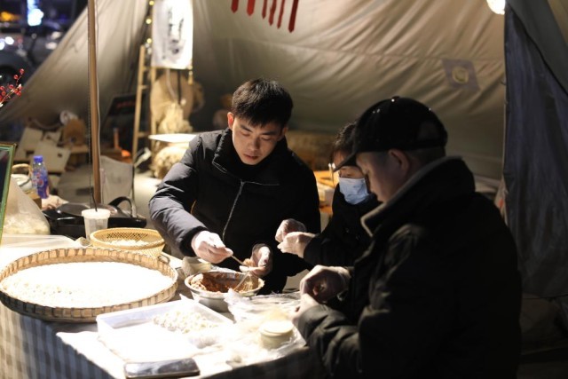 2月8日晚,李卫峰和家人在夜市摊位上包生煎包。新华社记者周思宇 摄