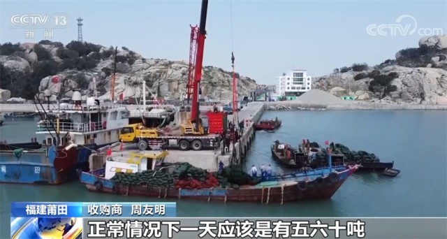 收购商 周友明:南日岛水质比较好,生长的龙须菜质量相对来说比较高,很多人都喜欢到南日岛来买龙须菜。正常情况下一天有五六十吨,基本上每天都来。