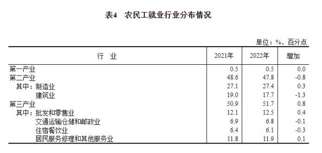 分产业看,99.5%的农民工从事二、三产业。其中,从事第三产业的农民工比重为51.7%,比上年提高0.8个百分点;从事第二产业的农民工比重为47.8%,比上年下降0.8个百分点。