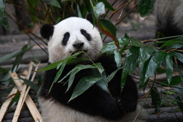 在成都大熊猫繁育研究基地,大熊猫“花花”在吃竹子。新华社记者胥冰洁 摄