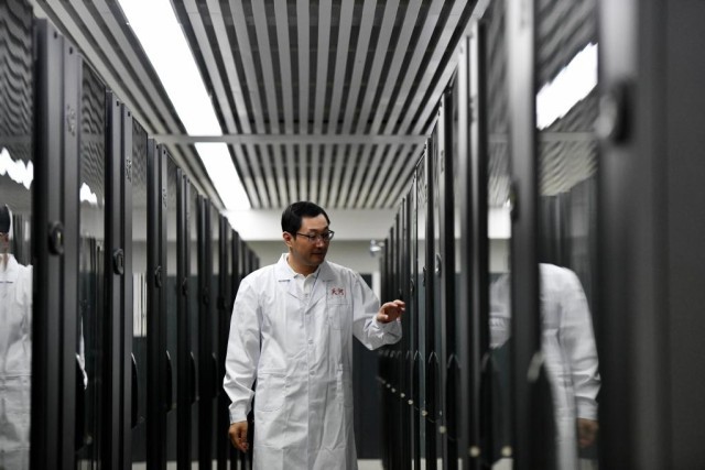 国家超级计算天津中心“天河一号”机房内,孟祥飞在查看设备运行状态。新华社记者 赵子硕 摄