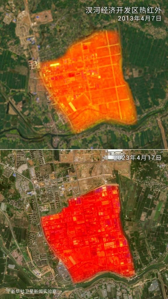汊河经济开发区,这是遥感卫星拍摄的热红外影像对比图。图中红色区域面积明显增大,意味着十年来随着工业生产和人流活动不断增加,这里的经济生活越发“火热”。