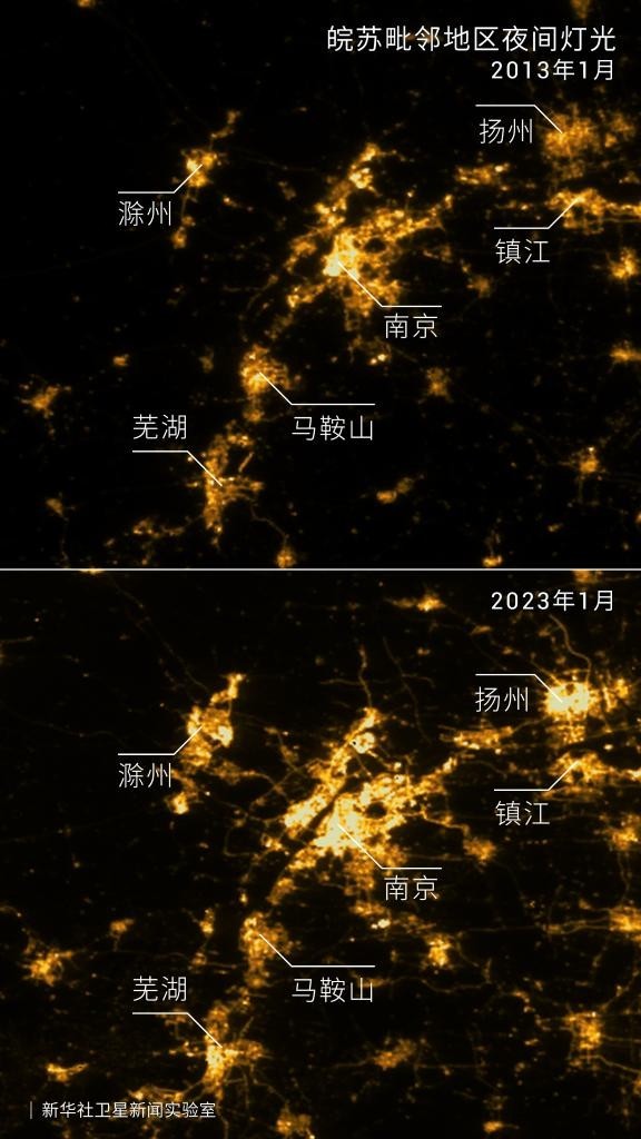 从太空望向皖苏交界区域,十年来,点点“星光”逐渐融成一片。