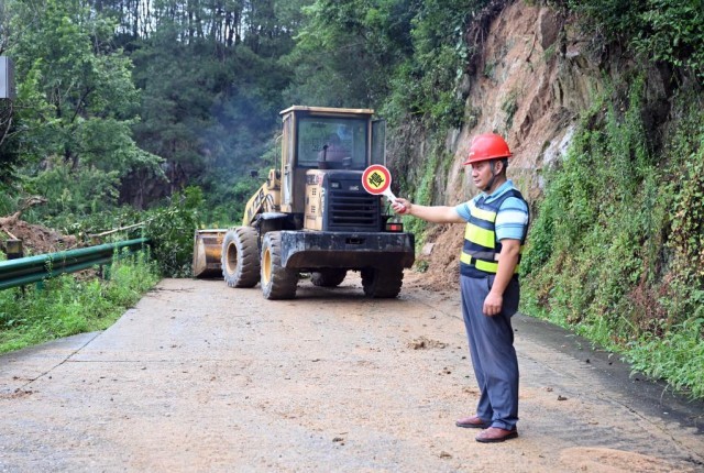 9日中午,在牛镇镇天桥村天天公路一段山体垮塌处,51岁的道路管理员王和松正手举警示牌示意过往车辆暂停通过。在其身后,一辆铲车不断地将散落在干道上的泥土、树枝等清理干净。从早晨6时许出门,王和松和同事一上午已经处理了5个点位。