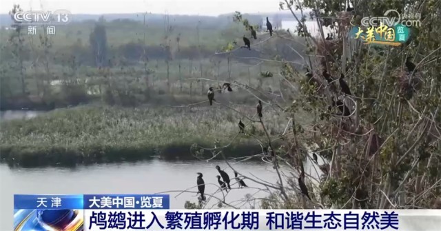 现在我们看到的是天津州河湿地公园。近段时间,这里迎来丰水期,栖息的鸬鹚鸟群也进入繁殖和孵化期。在湖面上随处可见鸬鹚悠闲地游弋,岸边林木茂盛、满眼青绿,到处都是一片生机勃勃的景象。据了解,州河湿地是永久性河流和洪泛平原湿地,总面积超过500公顷。近年来,当地通过修复河岸,打造物种多样性生存环境,不断完善湿地区域的功能性保护与检测。目前,湿地公园内记录到植物351种,白鹭、红隼、红嘴鸥、蓝翠鸟等鸟类131种。