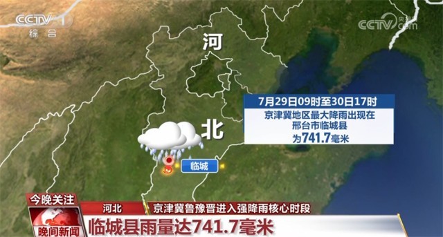 从7月29日开始,河北也进入降雨的最强时段。7月29日09时至30日17时,京津冀地区最大降雨出现在邢台市临城县,为741.7毫米。河北省气象台7月30日发布暴雨红色预警信号,河北省气象灾害防御指挥部将重大气象灾害暴雨应急响应调升至Ⅰ级。