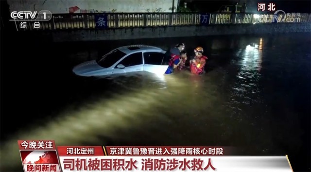 受强降雨影响,河北定州多个路段出现积水。7月30日凌晨,在当地一处桥洞,一名司机因路况不熟误入积水区,导致车辆熄火,半个车身被水淹没,被困车内。接警后,当地消防人员立即赶到事发路段,在做好安全防护后,涉水将被困司机救出。同样,在河南新乡凤泉区一铁路地下通道口,一辆轿车被困积水中,消防人员携带救生衣、救生圈蹚水靠近被困车辆,陆续将车内人员从车窗抱出,护送她们离开积水区域。