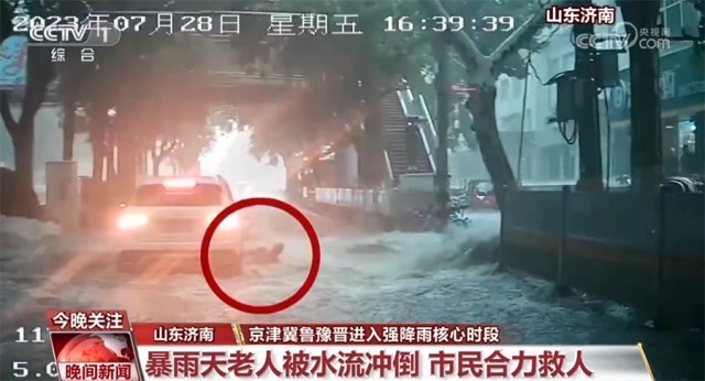 从28日开始,济南也遭遇强降雨,暴雨导致一位行动不便的老人被水流冲倒,整个身体几乎都淹没在水中。危急时刻,一名公交车司机迅速打开车门,与路过的几位市民一起齐心合作,将老人救出。