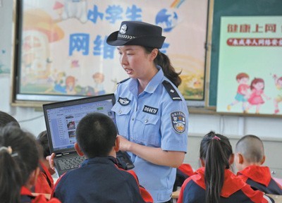 江苏省海安市公安局墩头派出所民警在学校引导学生安全上网、文明上网。