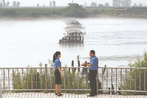今年7月20日,丹东市检察院检察官与丹东市振安区检察院检察官走访鸭绿江浮桥遗址。 本报记者张哲摄