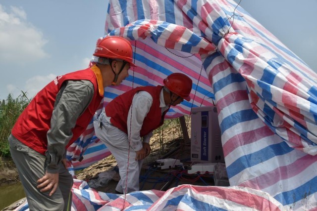 立杆8根、架设线缆580米、安装配电柜和大容量电表……13名电力工人顶着烈日,在一天时间内为维新涵闸拉通了“抽水通道”。
