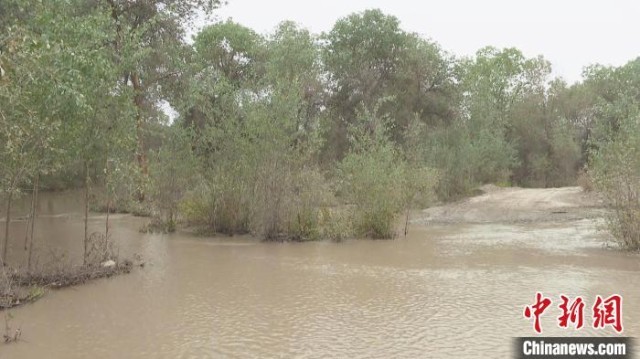 洪水流入哈拉坤胡杨林区深处,42.17万亩胡杨林迎来新一轮生态补水。塔依尔·艾力 摄