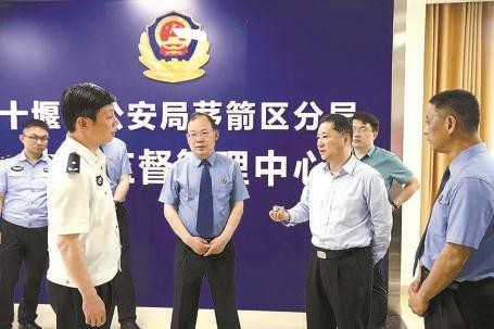 湖北省检察院常务副检察长金鑫(右二)在十堰市茅箭区公安分局侦查监督与协作配合办公室调研。