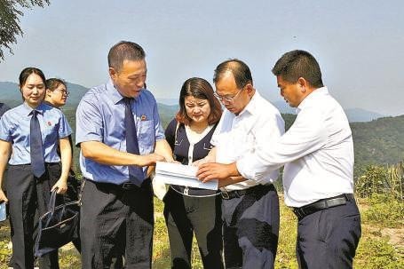 湖北省十堰市检察院检察长刘少军与全国人大代表、十堰市太和医院护理部主任李龙倜(右三)现场查看案件办理成效。