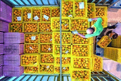 在湖北秭归县脐橙文旅小镇数字化电商中心,工作人员将夏橙装车。新华社发