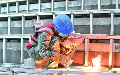 工人在北京城市副中心图书馆项目施工现场施工。新华社发