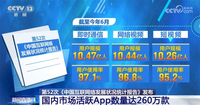 另外,《报告》显示,上半年,我国各类互联网应用持续发展,多类应用用户规模获得一定程度的增长。截至今年6月,即时通信、网络视频、短视频用户规模分别达10.47亿人、10.44亿人和10.26亿人,用户使用率分别为97.1%、96.8%和95.2%;网约车、在线旅行预订、网络文学的用户规模较2022年12月分别增长3492万人、3091万人、3592万人,增长率分别为8.0%、7.3%和7.3%,成为用户规模增长最快的三类应用。