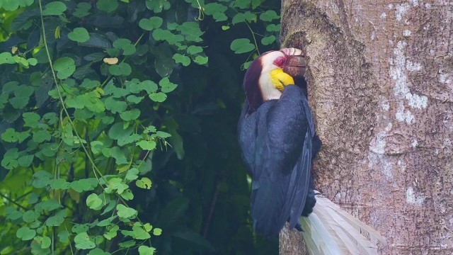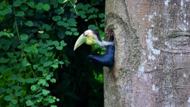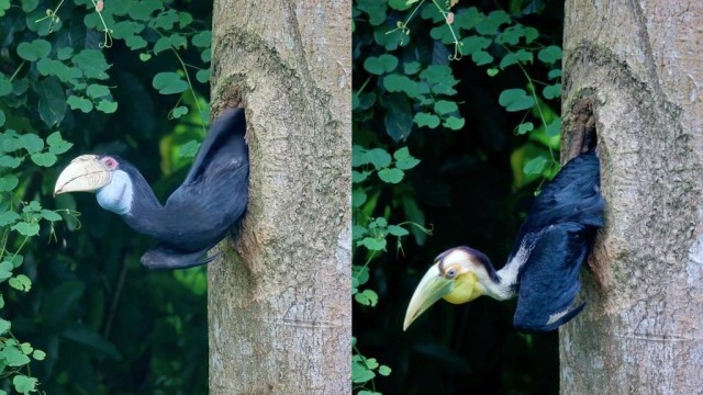 树巢里的犀鸟宝宝也开始探出可爱的小脑袋,打量着树巢外的世界。在多次观察和适应后,犀鸟宝宝也学着妈妈把身体往外挤,经过不断尝试后最终飞出了树巢,在犀鸟父母的带领下,飞向热带雨林深处。
