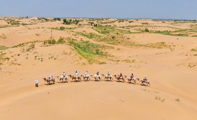 游客在鄂尔多斯市达拉特旗境内库布其沙漠中的银肯塔拉景区体验骑骆驼(7月29日摄,无人机照片)。新华社记者 彭源 摄